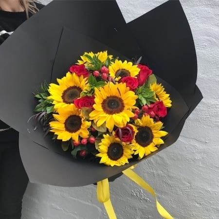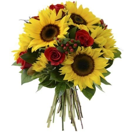 Gorgeous, vibrant, fresh bouquet of sunflowers, red roses & hypericum or after dark foliage - to brighten someone`s day. To allow these beautiful flowers to last much longer, they are shipped fresh, partially in bud, and ready to bloom.